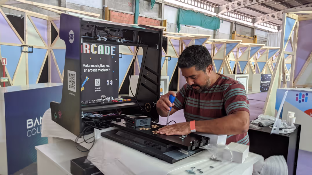 The Beat Machine started life as a fun project for NJ Lang, a well known member of the Endlesss community. He built the first version in his garage. We were understandably blown away by this, and flew out to the US, where we toured the unit around New York with him during NFT NYC to get it in front of people.